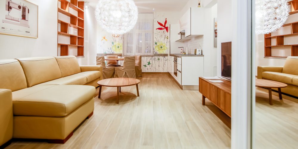 Bigger apartment in the basement with individual terrace partially illuminated with natural light, accessible by stairs, convenient for smokers (terrace) and individuals with mild sleep (the possibility of complete darkening of bedrooms). Spacious living room with well applied kitchen, dining area, pull out sofa (additional 2 beds), dressing room, bathroom and two bedrooms. All beds […]