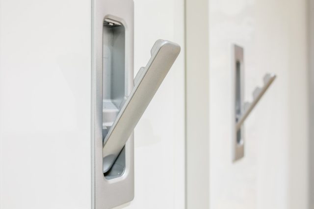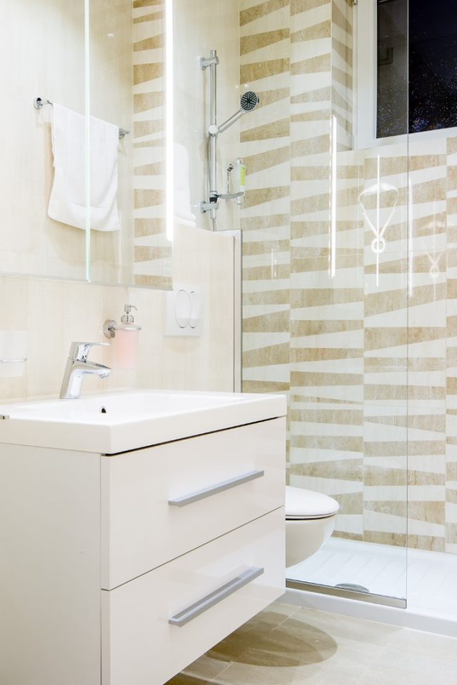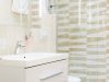 Kopalnica: kabina za prhanje, pralni stroj, omarica nad umivalnikom, sušilec za lase, standardna električna vtičnica za higienske aparate, wc školjka.